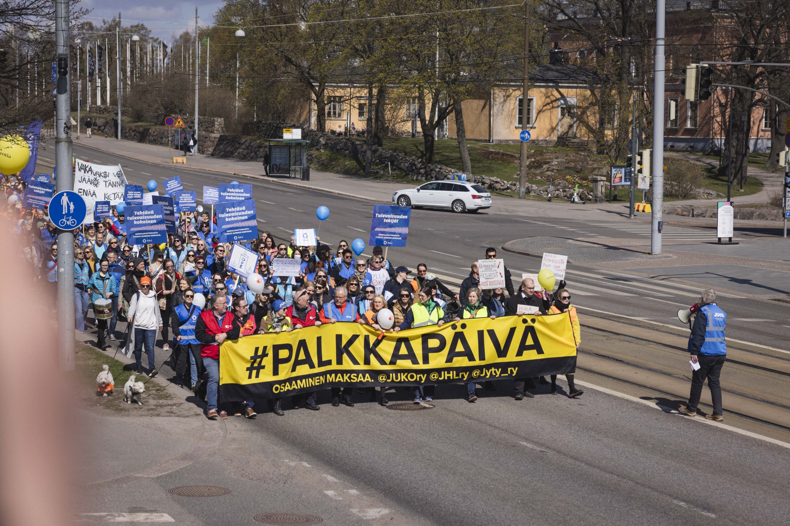 Kuva Palkkapäivä-mielenilmauksesta 6.5. Oikealla megafonin kanssa jutun kirjoittaja Jaakko Korpisaari. Kuva: Vessi Hämäläinen